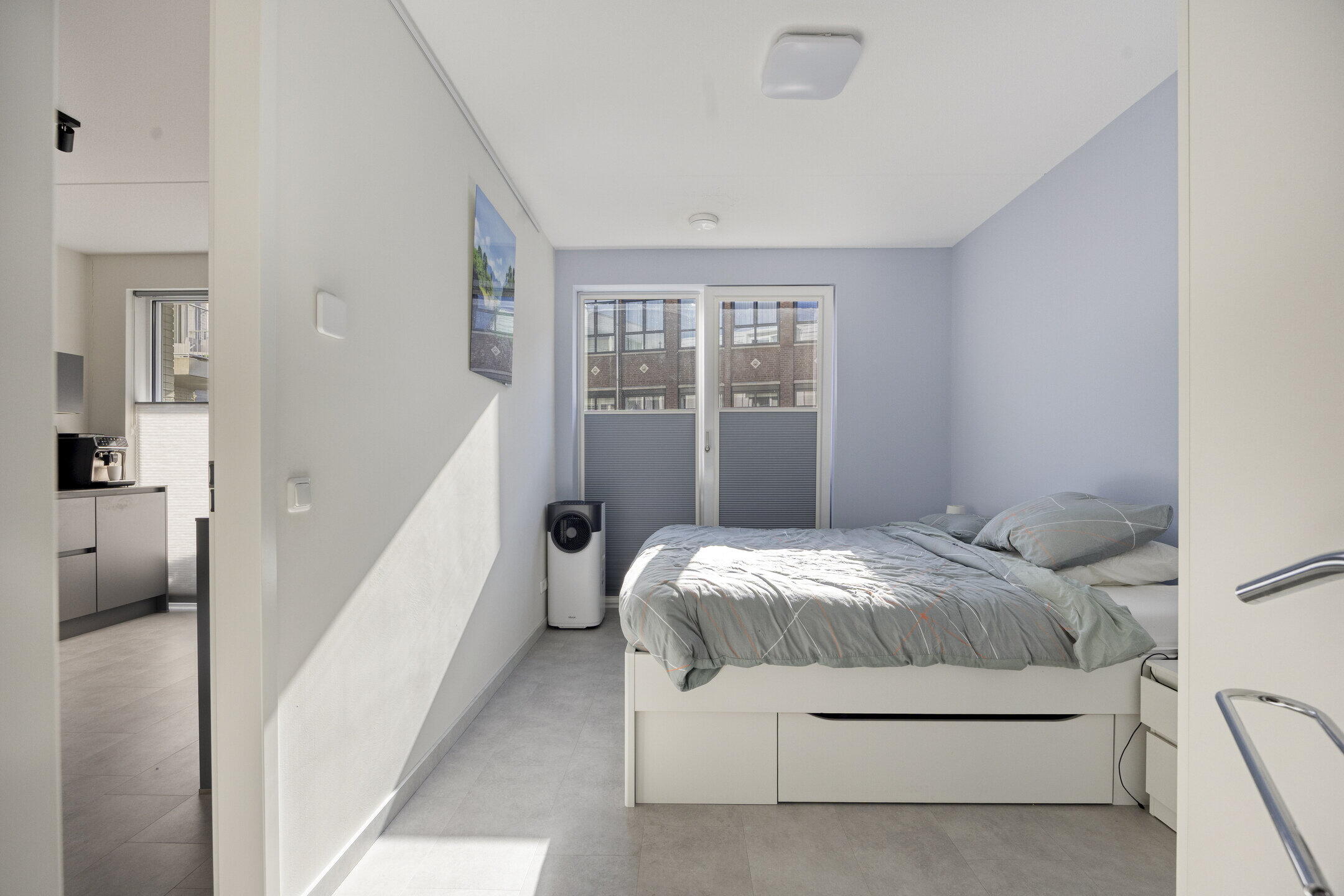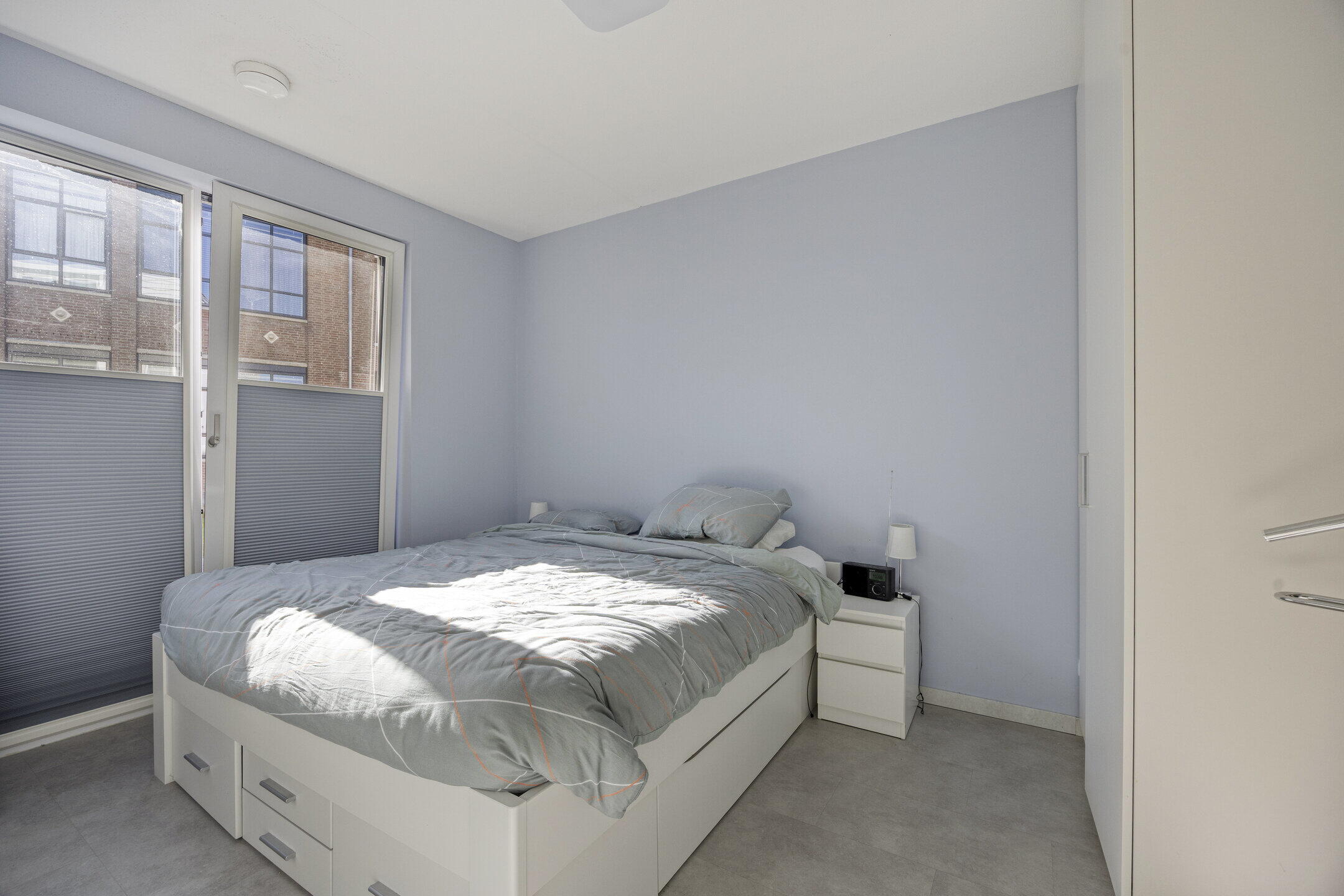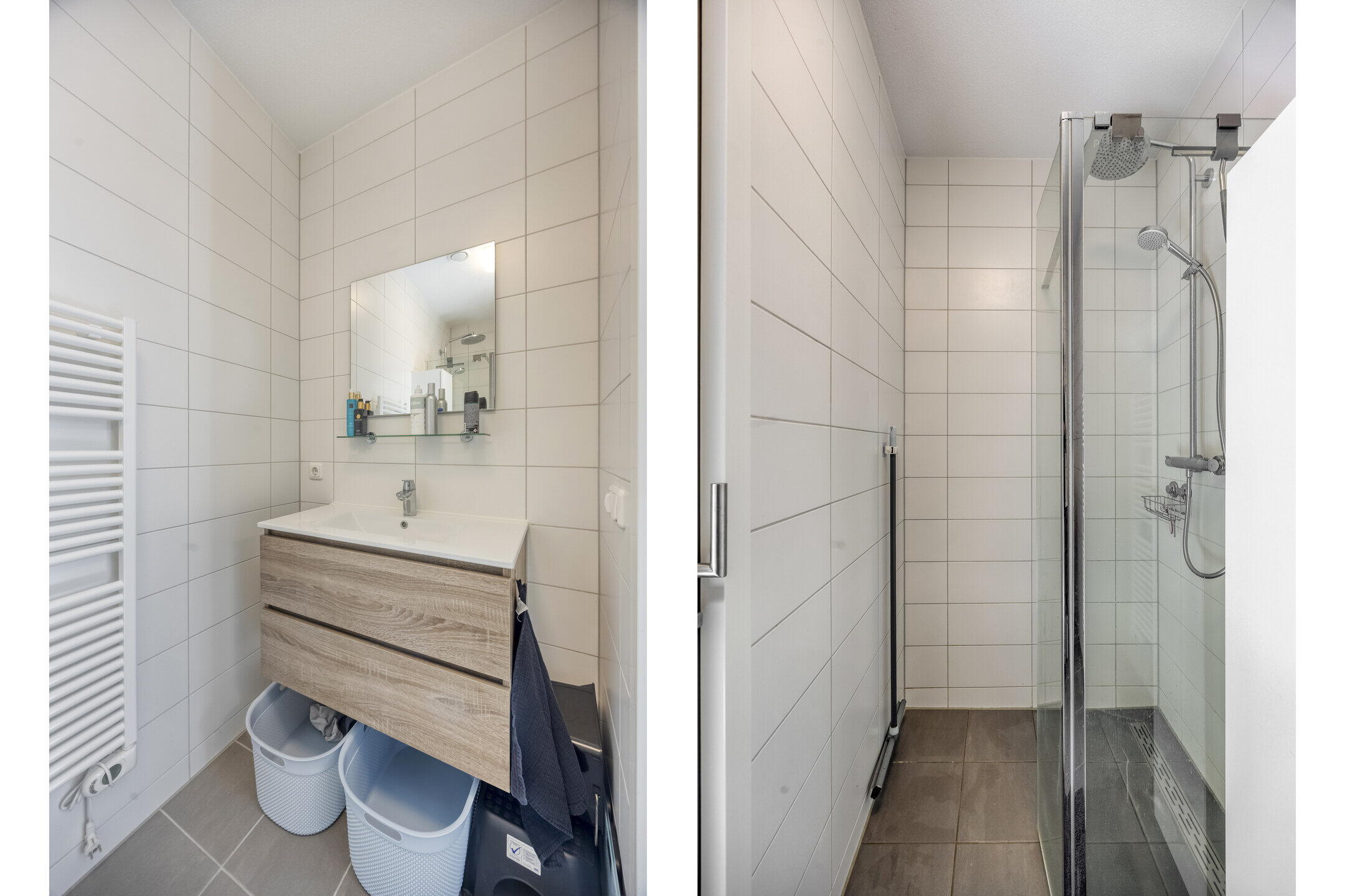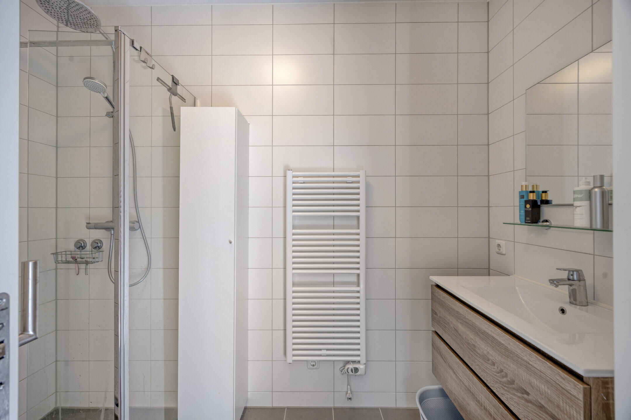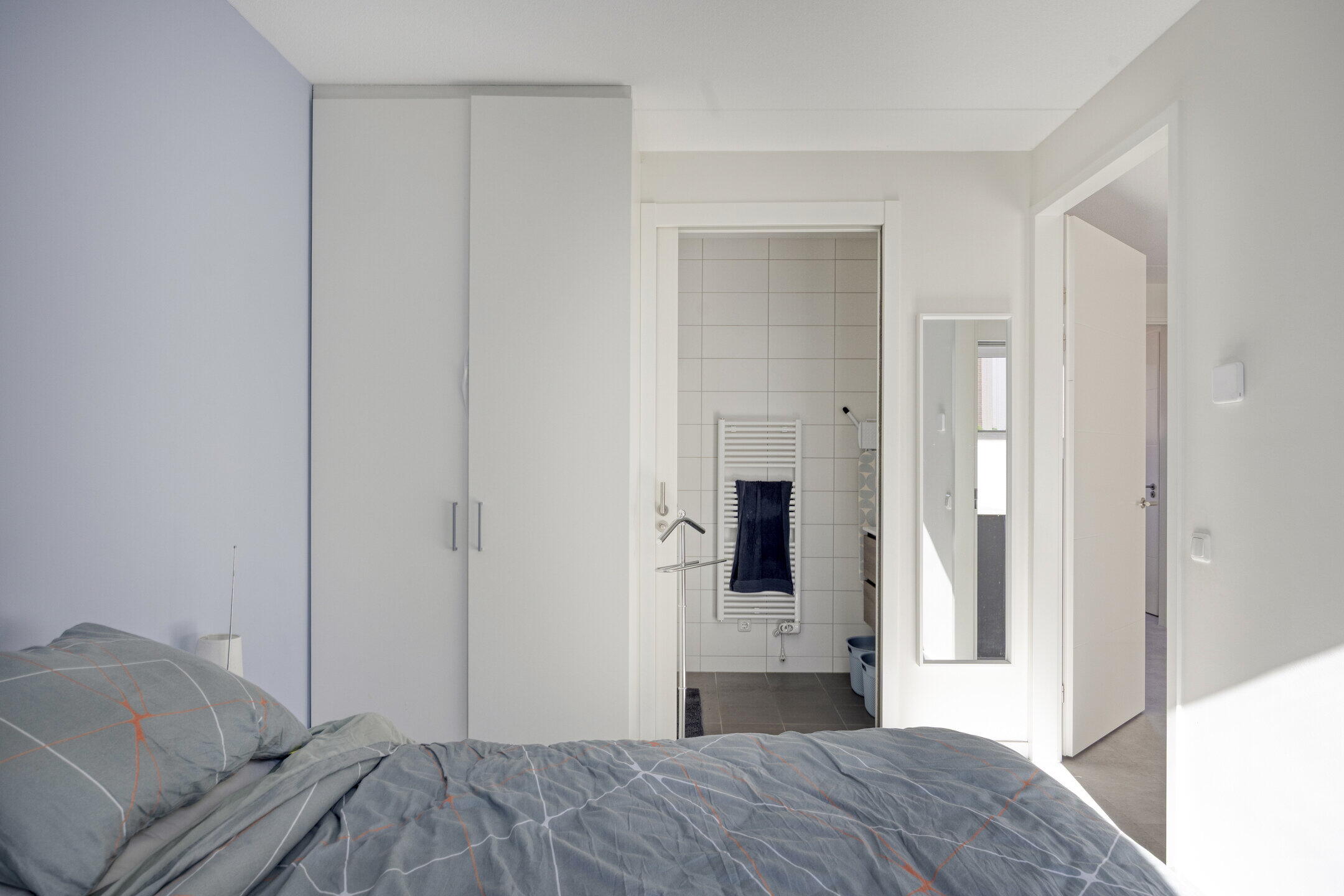 De slaapkamer is comfortabel en praktisch ingericht en biedt directe toegang tot de badkamer. De badkamer is modern uitgevoerd met een inloopdouche, een stijlvol badkamermeubel en een designradiator—een fijne plek om de dag fris te beginnen of ontspannen af te sluiten.